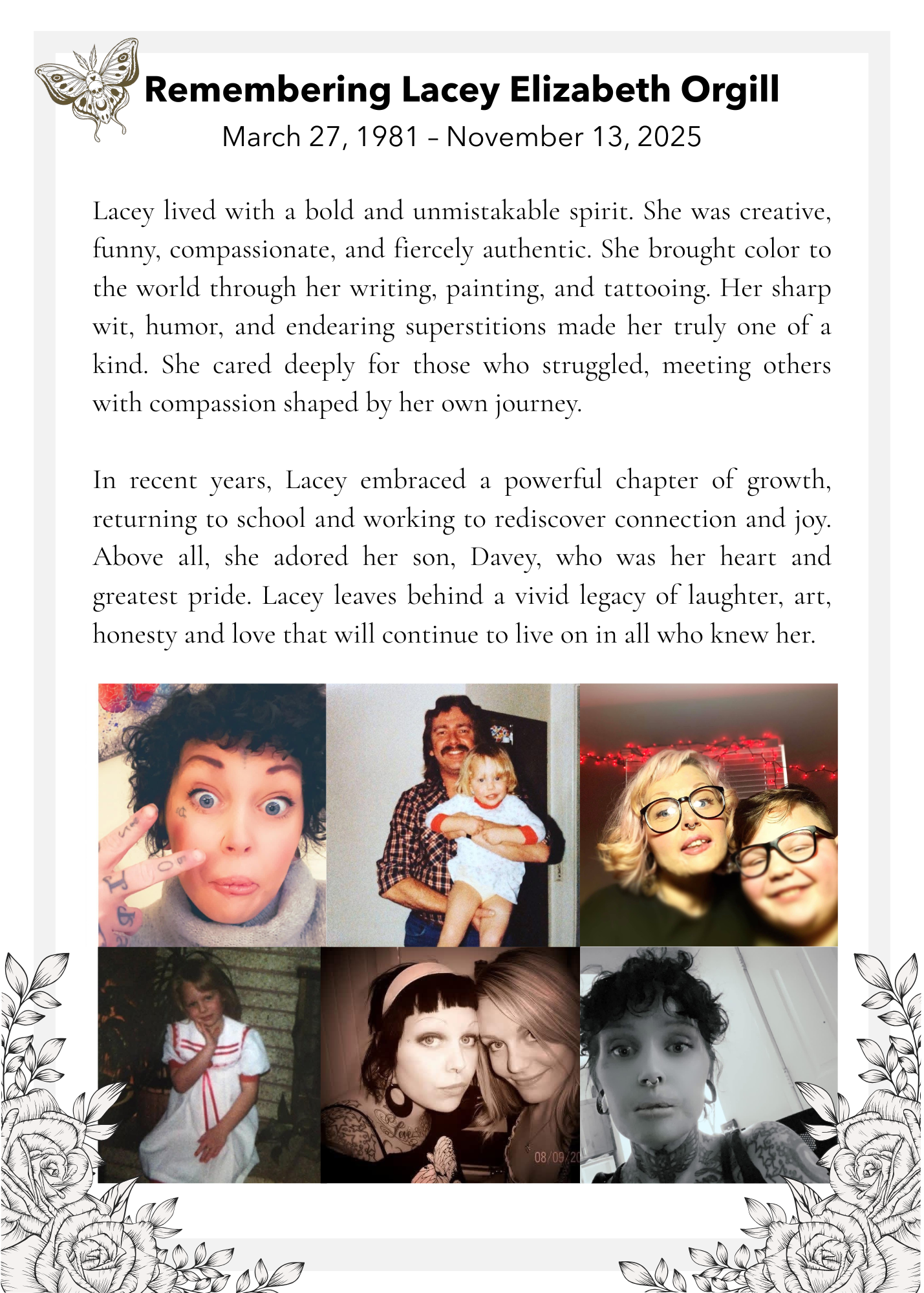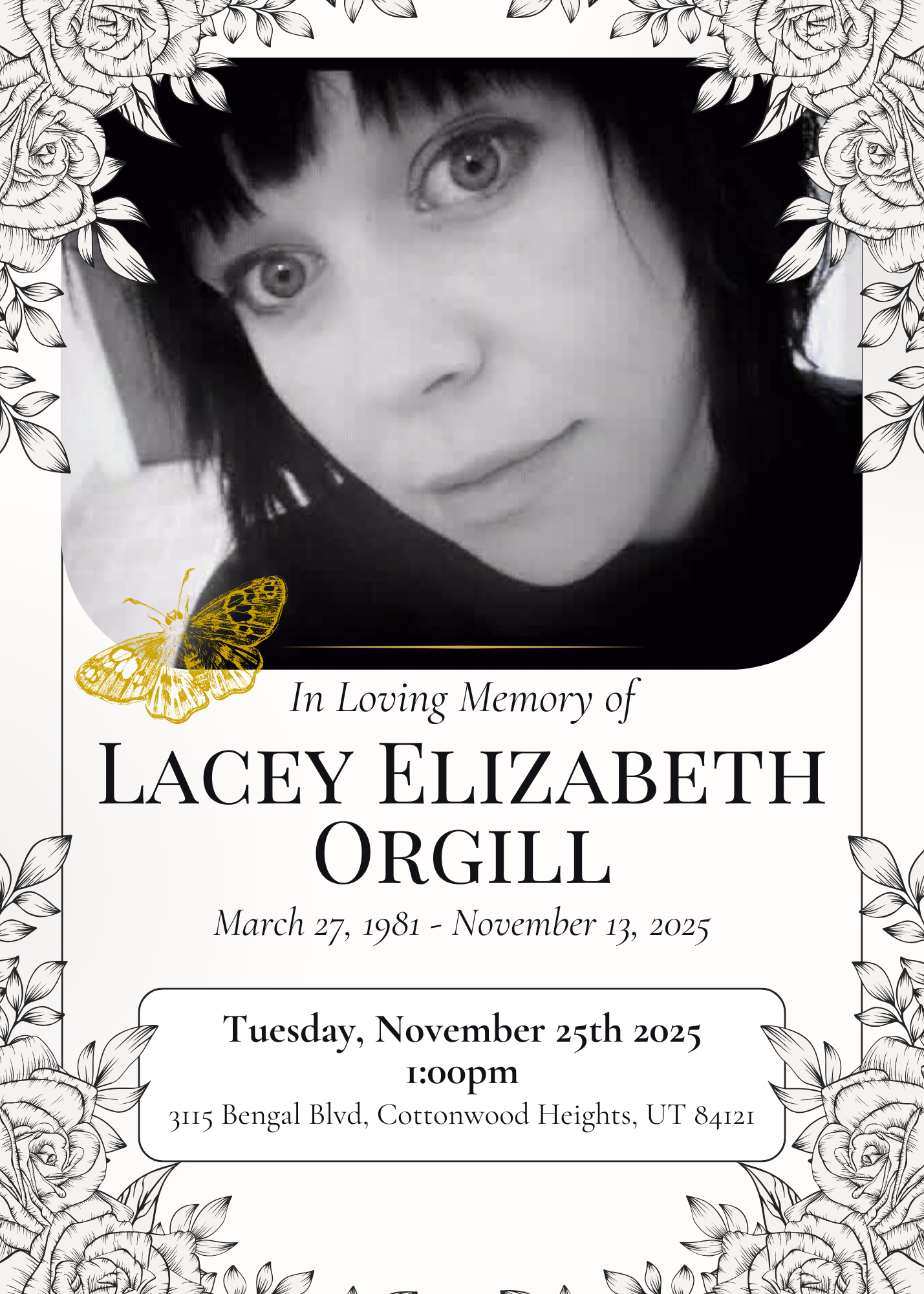 Lacey Elizabeth Orgill, beloved daughter, sister, mother, and friend, passed away on November 13, 2025, at the age of 44. She was born on March 27, 1981, in Salt Lake City, Utah. A natural writer and artist, she expressed her creativity across various mediums throughout her life, including music and painting. She had a quick wit and a sharp sense of humor, often the one making others laugh.
